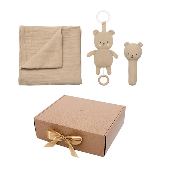 Eksluzywny zestaw upominkowy, idealny na prezent dla noworodka lub przyszłych rodziców na Babyshower: zawiera wszystko, co potrzebuje niempowlak od pierwszych dni swojego życia. W tym uroczym zestawie prezentowym, zapakowanym w eleganckie pudełko znajdują się trzy starannie wyselekcjonowane produkty: milutki i mięciutki kocyk-otulacz bawełniano-muślinowy, urocza pozytywka - zawieszka z wizerunkiem beżowego misia, oraz grzechotka miś.